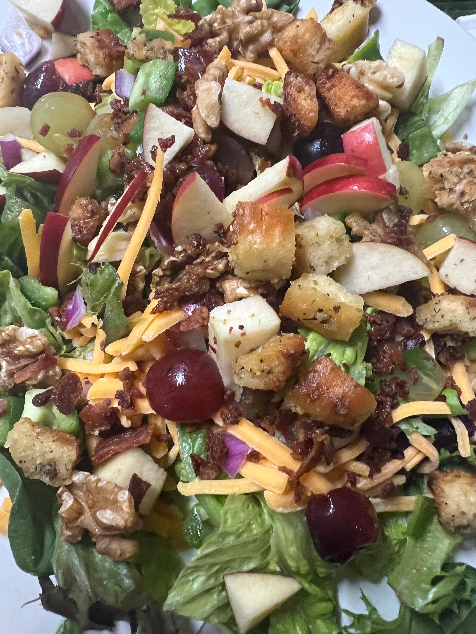 Fruit & Nut Salad – Crisp grapes and apples tossed with crunchy walnuts, our house-made croutons, and a sprinkle of bacon bits for a wholesome, colorful dish.
